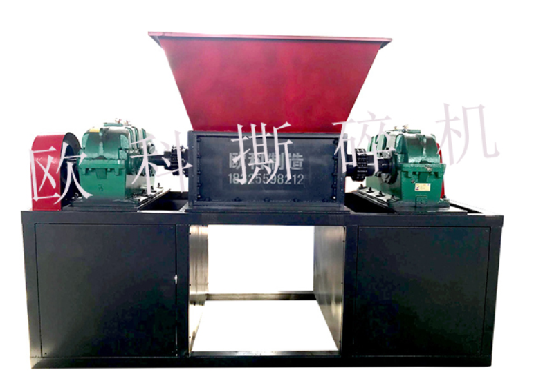 1、采用雙軸或單軸低速轉動,利用刀盤對物料進行切、割、撕、拉。直連蝸輪蝸桿減速電機,直接安裝在粉碎機主動軸上,通過齒輪變速傳至從動軸,使主動軸的動刀與殼體上的靜止刀盤形成相對運動。主動軸上的螺旋齒刀盤交錯排列,使物料進入后,同時受到擠、撕、剪的作用,從而使物料得到破碎。